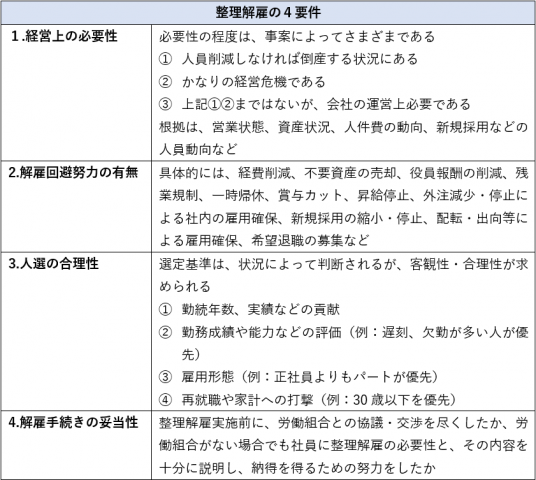 整理解雇は、パートタイマーの雇止め、臨時社員の削減、新規学卒者、中途採用の採用削減・停止、退職者の不補充、配置転換、出向、転籍、希望退職者の募集などの施策を講じても、なお人員削減の目的を達成できなかったときの最終手段です。整理解雇を実施するには、以下の4つの要件を満たさなければなりません。